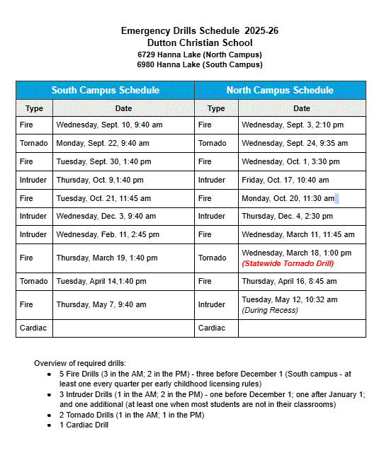 At Dutton Christian, the safety and well-being of our students, staff, and families is our highest priority. We are committed to maintaining a secure and nurturing environment by following established safety protocols, providing ongoing training for our staff, and working closely with local safety officials. Every child deserves to learn and grow in a place where they feel protected, cared for, and supported.