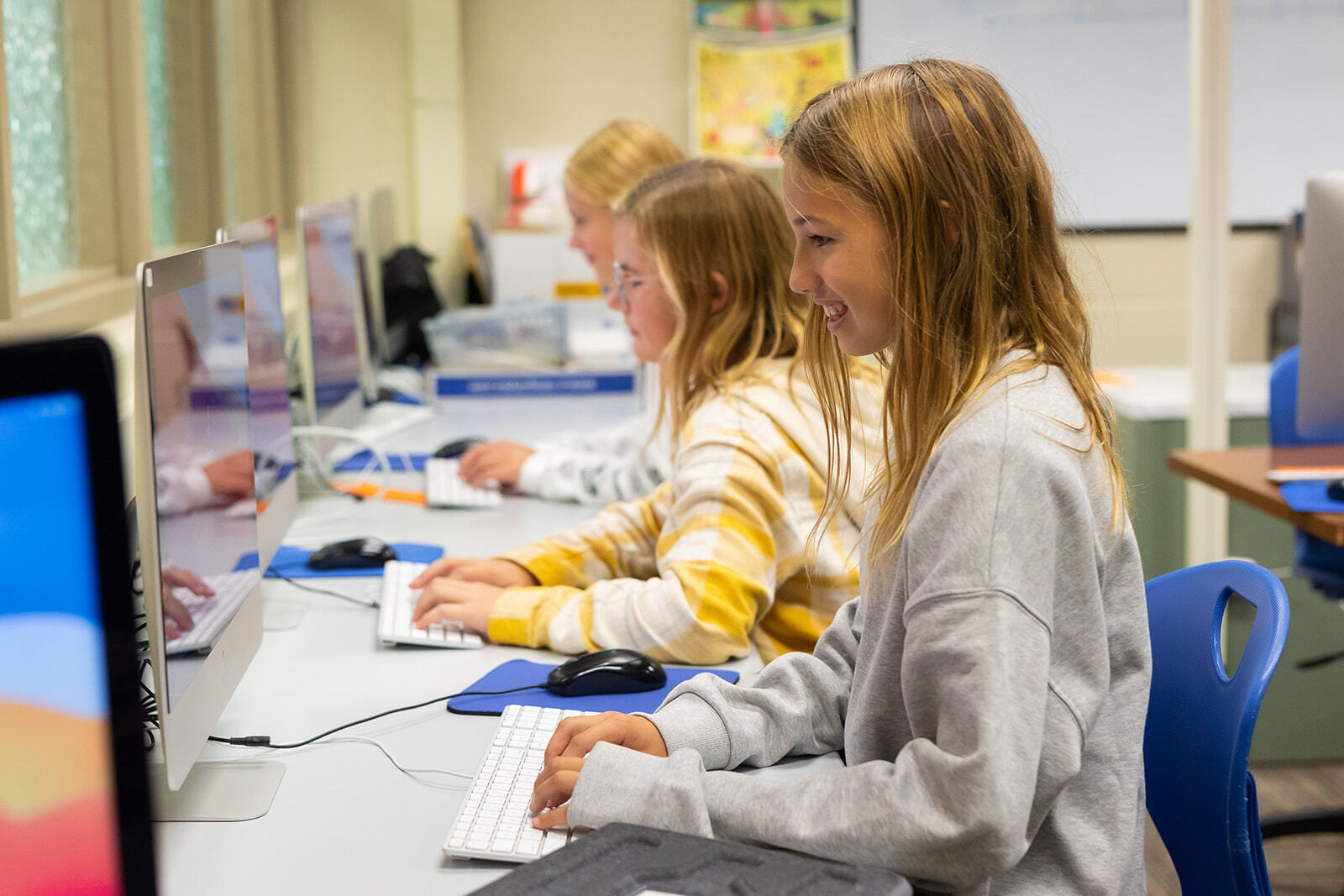 Students in first through fifth grade have computer class once a week for 45 minutes. Students work on a variety of projects using researching, presentation, and keyboarding skills. Engaging lessons incorporate S.T.E.A.M (science, technology, engineering, art, math) content as well as coding. Upper elementary students collaborate with classmates using Google Suite: Google Slides, Docs, Sheets, Forms, Word Art, and Canva. They enjoy creating projects that have a purpose for a real audience. Coding projects are integrated in K-8th grade.