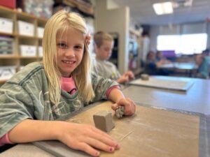 Students in E5 through 4th grade enjoy a dedicated library class each week, filled with engaging read-alouds and the excitement of choosing their own books. For students in grades 5–8, the north campus library is open throughout the school day for drop-in visits, allowing them to check out books at their convenience.